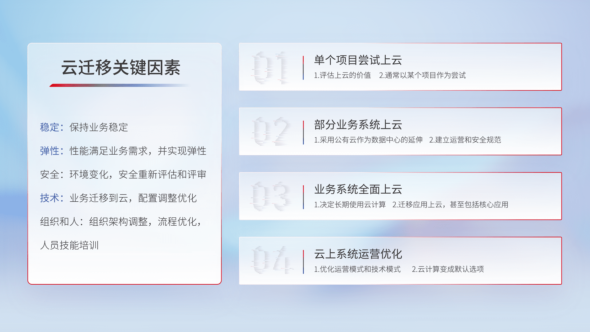 结合实际业务,,,从规划设计、、、、云平台选型、、、云原生改造、、数据迁移、、、集成交付,,迁移全过程为客户识别最佳上云路径,,做好风险识别管理,,,,设计网络架构、、、、身份权限、、、安全审计合规、、操作审计、、日志审计、、、监控告警策略、、、、多站点容灾设计等,,,对云上基础设施进行整体规划,,提升IT治理水平,,以满足弹性、、、、高可用、、、高性能的需求。。。。